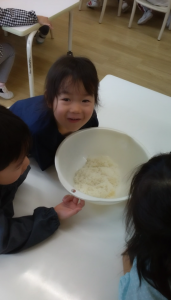 10分ほどで、もち米はもちもちのお餅にかわり、捏ねていると手にくっついてしまい…手を洗いに行き…再び挑戦するなど、お餅の感触を楽しんでいました。