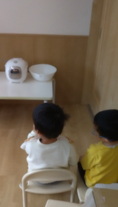 炊飯器のスイッチを入れると、「いいにおいしてきた!」「まだかな?」と興味津々。