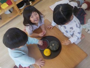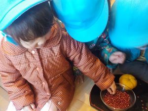 つき組ではかぼちゃにすぐ気づき「かぼちゃだ!」と言葉にしたり、柚子を見て「オレンジ!」や「みかん!」と知っているものと繋げて伝えてくれる姿がありました。「似ているね、これは柚子だよ。」と伝えると「すっぱい?あまい?」と不思議そうに柚子を見て興味を示している様子がありました。「柚子を入れたお風呂に入ると風邪や病気に負けない強い身体になるんだよ。」と分かりやすい言葉で伝え、興味が広がるよう関わりました。小豆は小さくつぶつぶしている感触を楽しむように1粒ずつ取って手に集めたり器の中で混ぜるように触れて「音がする!」と感触や音など五感で冬の食材に触れていました。子どもたちの発見を共感、共有しながら食材や日本の文化への興味が広がるよう関わりました。