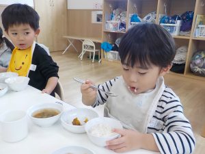 また、12月22日(月)は「冬至」にちなんだ行事食でした。実際に見て触れた食材が使われていることに気付くと「先生見て、小豆はいってるよ!」「あんこになってるんだよね。」「甘くておいしいね。」「これ、みかんじゃなくて柚子だよね。」等、見たことのある食材に興味を示し、触った時の色や感触の違い、食べてみた時の味を子どもたちなりにたくさんの言葉で伝えてくれました。冬至という1年で日照時間が最も短い日があるということや、健康に過ごすことが出来るようお風呂に柚子を入れること等、日本の伝統に興味や親しみが持てるよう、分かりやすい言葉で伝えていきました。