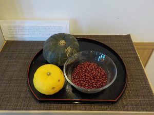 12月の室内装飾は、【冬至】をテーマに、柚子・かぼちゃ・小豆を飾りました。