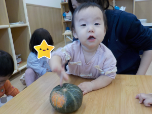 ほし組では、装飾の柚子・かぼちゃ・小豆に興味津々で触れてみる姿がありました。「つるつる?ぼこぼこ?どんな感じがするかな。匂いはするかな?」等言葉をかけながら関わると、手でじっくりと触れたり匂いを嗅いでみたりする姿がありましたよ。かぼちゃは「やさい」という絵本の表紙になっており、同じことに気づくと絵本を持って見比べてみる子もいました。小豆は手から落ちた時の音や様子が面白かったようで、何度も「ぱらぱらー!」と言いながら落としてみて、跳ねる様子や音を楽しんでいました。冬至という日があることを言葉にして伝えることで、「とーじ!」と言葉にする姿もありましたよ。
