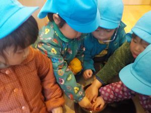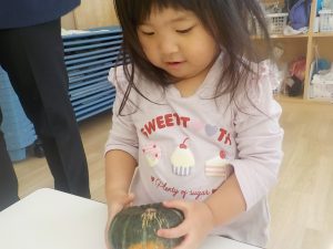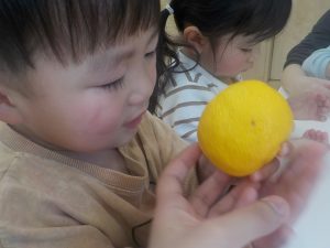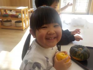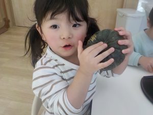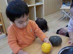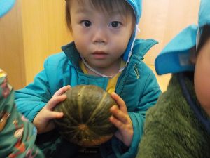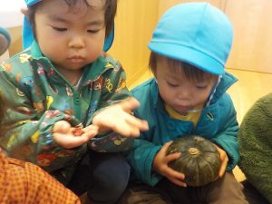 そら組では、装飾に気が付くと「これ何?」「みかんだ!」「赤いのちっちゃいね。」と話しながら興味津々の子どもたち。「これは柚子だよ。」「こっちは小豆だよ。あんこにもなるんだよ。」「かぼちゃもあったね!大きいね!かたいね!」と保育者が伝えると、匂いを嗅いだり手に持ち感触を確かめたりしていました。「いい匂いがするよ。」「あんこ食べたことあるよ!」「甘いんだよね!」「かぼちゃの中は黄色いよね。」と子どもたち同士でやりとりする姿も見られました。