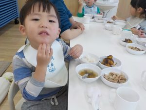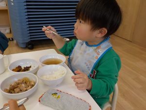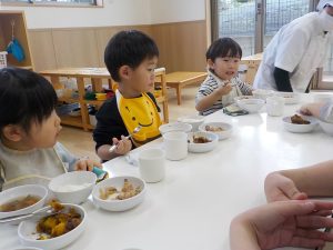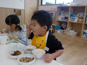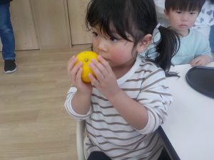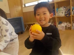 また、12月22日(月)は「冬至」にちなんだ行事食でした。実際に見て触れた食材が使われていることに気付くと「先生見て、小豆はいってるよ!」「あんこになってるんだよね。」「甘くておいしいね。」「これ、みかんじゃなくて柚子だよね。」等、見たことのある食材に興味を示し、触った時の色や感触の違い、食べてみた時の味を子どもたちなりにたくさんの言葉で伝えてくれました。冬至という1年で日照時間が最も短い日があるということや、健康に過ごすことが出来るようお風呂に柚子を入れること等、日本の伝統に興味や親しみが持てるよう、分かりやすい言葉で伝えていきました。