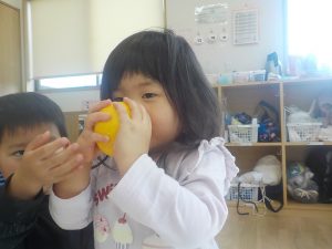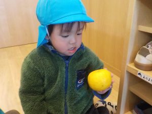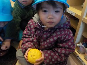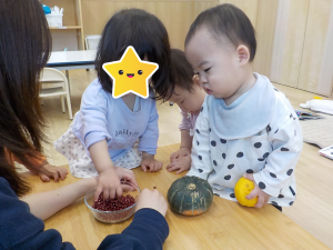 ほし組では、装飾の柚子・かぼちゃ・小豆に興味津々で触れてみる姿がありました。「つるつる?ぼこぼこ?どんな感じがするかな。匂いはするかな?」等言葉をかけながら関わると、手でじっくりと触れたり匂いを嗅いでみたりする姿がありましたよ。かぼちゃは「やさい」という絵本の表紙になっており、同じことに気づくと絵本を持って見比べてみる子もいました。小豆は手から落ちた時の音や様子が面白かったようで、何度も「ぱらぱらー!」と言いながら落としてみて、跳ねる様子や音を楽しんでいました。冬至という日があることを言葉にして伝えることで、「とーじ!」と言葉にする姿もありましたよ。