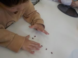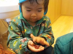 つき組ではかぼちゃにすぐ気づき「かぼちゃだ!」と言葉にしたり、柚子を見て「オレンジ!」や「みかん!」と知っているものと繋げて伝えてくれる姿がありました。「似ているね、これは柚子だよ。」と伝えると「すっぱい?あまい?」と不思議そうに柚子を見て興味を示している様子がありました。「柚子を入れたお風呂に入ると風邪や病気に負けない強い身体になるんだよ。」と分かりやすい言葉で伝え、興味が広がるよう関わりました。小豆は小さくつぶつぶしている感触を楽しむように1粒ずつ取って手に集めたり器の中で混ぜるように触れて「音がする!」と感触や音など五感で冬の食材に触れていました。子どもたちの発見を共感、共有しながら食材や日本の文化への興味が広がるよう関わりました。