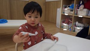 段々と粘土をこねていく中でイメージを膨らませていく子ども達、作った物を”みて!”と笑顔で見せてくれたり、保育者が「何をつくったの?」と聞いてみると「ケーキ」など自分のイメージを言葉にして伝えてくれます。