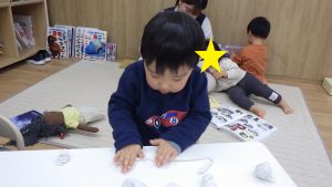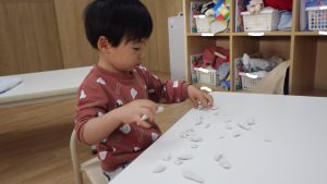 つき組では五感を使ったり、イメージを形にする遊びの1つとして粘土を子ども達が見える場所に設置しています。粘土を見て「粘土したい!」や「こねこね」と言葉で粘土をすることを伝えると自分の椅子座る姿があります。