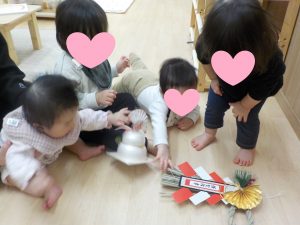 しめ縄の飾りが気になり触る子もいれば、お餅の方が気になり手に取る子と様々でした。