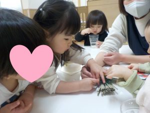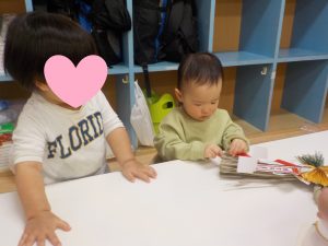 「壁に貼ってある写真と一緒だね」との言葉に写真を指差して実物の鏡餅と写真の鏡餅を見比べ同じことに気が付いたり、他児が触れている姿に”なんだろう?”と興味を持ち、手をのばして触れて確かめてみる姿も見られました。