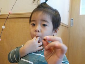 小豆を触ってみると、「なんか音がするよ」と教えてくれました。小豆から手を離すと、小豆が手にくっついてきて、不思議そうに見つめる子もいましたよ。保育者がこれは何か聞いてみると、「あずき」と既に知っている子もいれば、「丸」と気づいたことを教えてくれる子もいました!