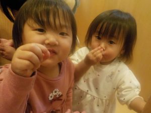 「これ何?」と興味津々のつき組さん。餅で作った花であることを伝えると、不思議そうに触っていました。普段触っている花の感触とは少し違うことを感じていたのかもしれません。