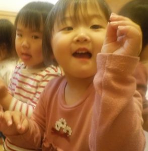 「これ何?」と興味津々のつき組さん。餅で作った花であることを伝えると、不思議そうに触っていました。普段触っている花の感触とは少し違うことを感じていたのかもしれません。
