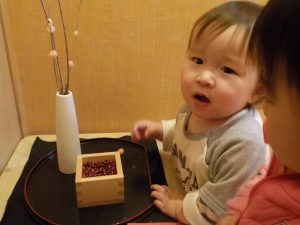餅花を見ると、手を伸ばしてツンツンと触ります。枝ごと持ち上げたり、餅花を取ろうと引っ張ろうとしていました。