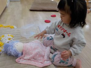 赤ちゃん人形遊びは、大人からしてもらった経験を赤ちゃん人形を通して再現することで、自分は大切にされているということを実感できる遊びの一つです。その為、保育者も本当の赤ちゃんに接するように大切に抱っこしたり話しかけて関わっています。赤ちゃん人形は子ども一人に対して一体用意していて、子どもが手に取ることの多い赤ちゃんを“自分の赤ちゃん”としてお世話遊びをしています。