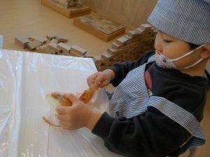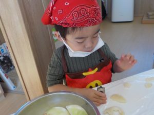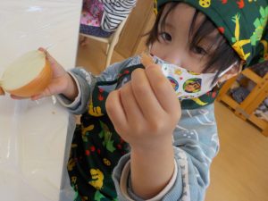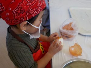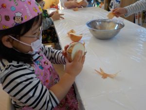 玉ねぎの皮むきでは、「茶色いところをむいてね」と伝えると、上からべりっと一発ではがしたり、少しづつ細かくはがしたり自分なりのむき方で一生懸命むく姿がありました。
