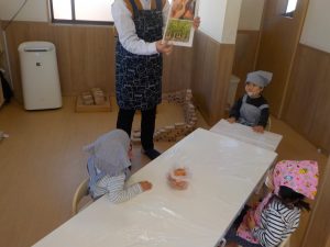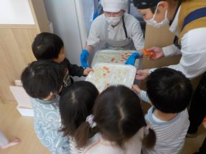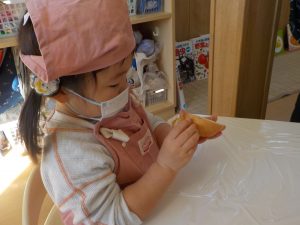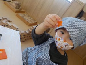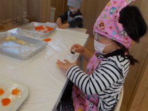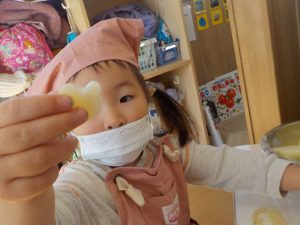 型抜きでは、人参が固く「手が痛い」等苦戦する姿が見られましたが、「先生と一緒にやる?」「やわらかいじゃがいもからやってみる?」と提案し、型が抜けると「見てー!○○ちゃんくまさんできた」と嬉しそうに見せる姿がありました!