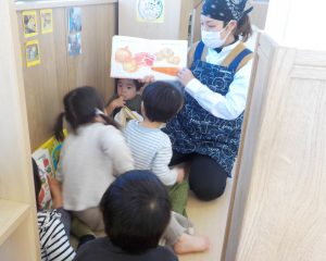 カレー作りが終わり、『カレーライス』の絵本を見ながら、「みんながやってくれたお野菜たちを調理の先生に持って行って、おいしいカレーにしてもらおう」と言うと、「○○ちゃんがやったのあるかな?」と完成を楽しみにしていました。調理の先生にお願いに行った後もカレーライスが気になって仕方ない様子のそら組さん。保育者が「そろそろできたかな?」と言うと「なんか、いいにおいする!」と2階の部屋で話していました。