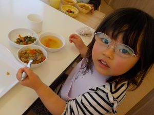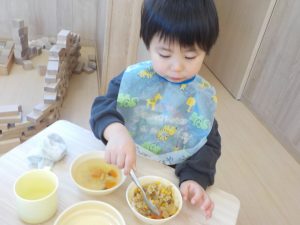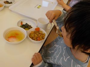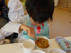 待ちに待った給食の時間。保育者がテーブルに並べたカレーの中にみんなが頑張って型抜きをした野菜を見つけ、「あった!」「〇〇くんもあった」とお友だちや保育者と共有しながら楽しんで食べる姿がありました!