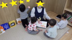 カレーライス作りで何をするか、見通しや期待が持てるようにする為に一週間程前からカレーライスの絵本を設置したり、保育室の壁に昨年のカレーライス作りの様子の写真を貼っていました。子ども達も写真や絵本に興味を持ち、保育者と一緒に材料は何かを考えてみたり、「これはなにしてるの?」と写真をみて気になったことを尋ねる姿がありました。
