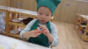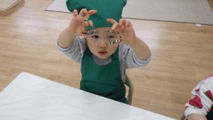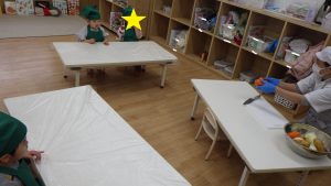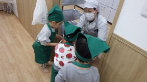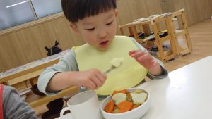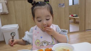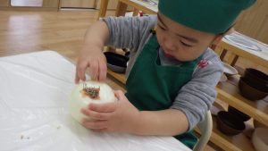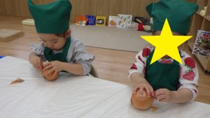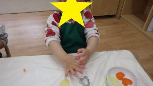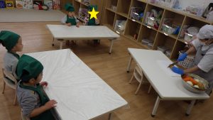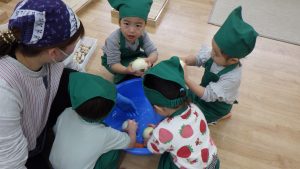 そら組での調理体験は今回で最後になりますが、今までの体験を通して食材に興味を持ったり、作る事の楽しさを感じるきっかけになったのではないかと感じています。今後も食べる楽しさを感じられるようなやり取りや、食材に触れる経験が出来る環境づくりをして食への興味を育んでいきたいと思います。