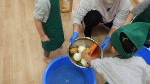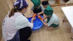 玉葱と一緒に人参とじゃがいもも洗ってくれました。じゃがいもを洗っている時に水の色に変化に気が付いた子どももおり、保育者と汚れが落ち綺麗になっていくことに気が付いていました。