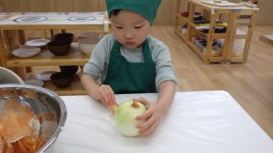 人参やじゃがいもを半分に切ると『やさいのおなか』という絵本が好きな子ども達は「人参のおなかだ!」「じゃがいものおなかだ!」と断面を見ながら絵本と実物を繋げていました。玉葱の皮を剥いている時に先端の茶色の部分を気にしていた子どもは玉ねぎの先端部分を切ると「全部白くなったね!」とすっきりした様子でした。