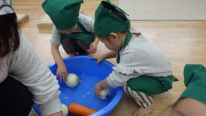 野菜をお部屋まで運ぶと興味のある野菜を選び、玉葱の皮を剥いたり、じゃがいもや人参を洗ったりしました。玉ねぎの皮を剥くときには真剣な顔で剥く子ども達、皮が剥けると一回一回「みてー!剥けたよ!」と笑顔で剥けた皮を見せて教えてくれました。