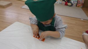 保育者もやりたい気持ちを受け止めそっと近くで見守っていると、野菜を型抜きから取り出すときも形が崩れないようにそっと取り出していました。
