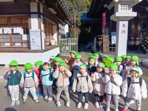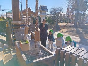 前回のお参りに行った際は、先生が神社でのお参りの作法を、一つ一つ丁寧に教え、頭を下げたりや手水舎で水をかける姿がありましたが、今回は子どもたちが自らやる姿が見られ、成長を感じました。