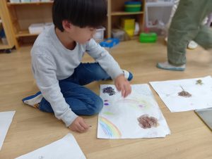 その後、話し合いを行い、調べたいテーマを決定。今回は「虫」「花」「土」「雲(空)」の4つのグループに分かれて活動を進めました。