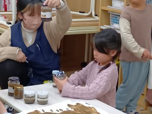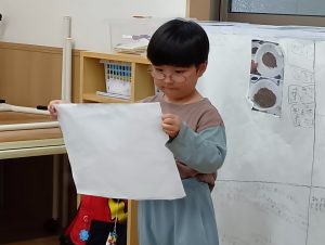 3・4歳児クラスで、気持ちが相手に伝わった時の嬉しさや満足感をたくさん経験してきた子どもたち。5歳児ではその経験を土台に、「どうしたら分かりやすく伝えられるかな?」と考えながら話すことを大切にしています。
