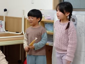 発表当日は、緊張してしまい途中、分からなくなってしまうこともありましたが、愛着形成の構築された保育者にアイコンタクトをとったり、友達に助けを求めたりしながら、発表する姿が見られました。