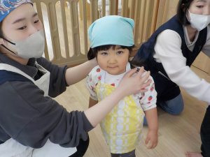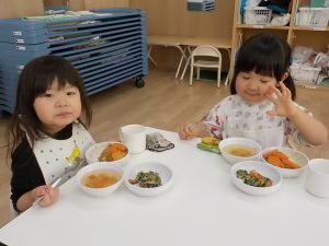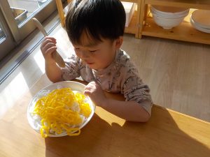 そら組では、うどん作り・クッキー作り・カレーライス作りと、様々な調理体験を行ってきました。食感・匂い・色等、見ただけでは気付かなかった発見がたくさんありました。実際に触れたり作ってみることで、食事中に「この野菜は何?」「何が入っているの?」と食材に興味を示したり、遊びの中でも、ケーキ・うどん・カレー等見立てて遊ぶ姿が多く見られています。今後も様々な調理体験や食育を通し、食への意欲や関心を深められるよう取り組んでいきます。