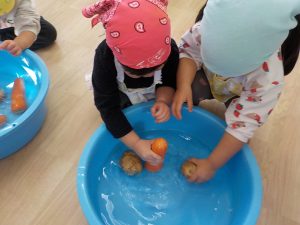 一通りのカレー作りの活動を終えた後も、食材に触れることを楽しむ子どもたち。型抜きに使った人参を指でちぎったり、押し潰したり、型抜きを包丁のように使いトントントンと細かく刻むことを楽しんでいました。玉ねぎは剥く、ちぎるを夢中になって行い、剥いているうちに目に染みて痛いという経験もしました。また、手に玉ねぎの匂いが付き、「玉ねぎの匂いする。」と手を洗っても匂いが消えないことにも気づき不思議に感じていました。