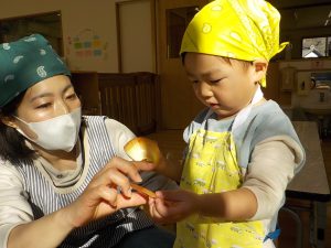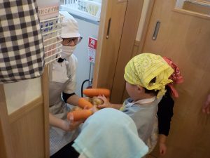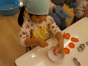 人参の型抜きでは、「見て!ウサギさんできたよ。」「鳥さんにしたの!」等、子どもたち同士でもやり取りをし、共有する姿がありました。子どもたちの“やりたい”という意欲に寄り添いながら見守り関わっていきました。
