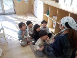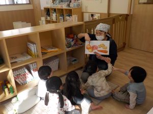 そら組では、1月22日(木)にカレーライス作りを行いました。子どもたちがカレーライス作りに期待を感じられるよう、以前から遊びや『カレーライス』の絵本、朝の会でカレーライス作りに関する話をしたこともあり、「今日、カレー作るよね!」「楽しみだね!」とカレーライス作りを楽しみにしている様子でした。初めに『カレーライス』の絵本を見て、どんな食材を入れるのか、作り方を絵本を通して確認していきました。保育者が「この野菜なーんだ?」と聞くと、「にんじん!」「じゃがいも!」「玉ねぎ!」と元気よく答える姿や、「トントントン」と食材を切る場面では、一緒に「トントントン」と言ったり「赤いのお肉だよね!」と、野菜以外にも興味を示す姿があり、カレー作りへの期待が高まっているようでした。