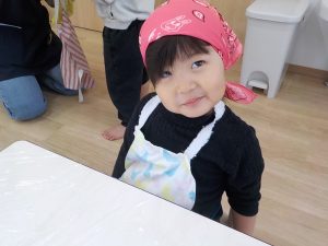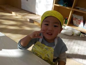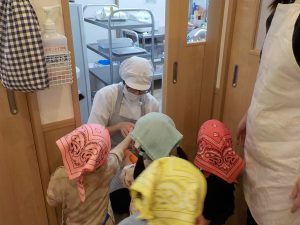 型抜きを終えた後は、調理の先生に渡しに行きました。「○○ちゃんのこれ!」「美味しく作ってね!」と伝え、給食を楽しみにしているようでした。