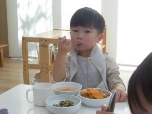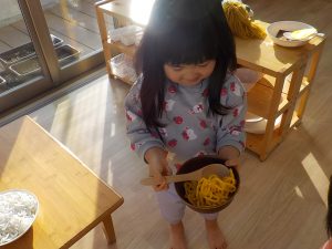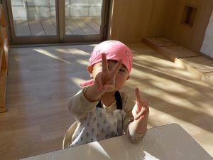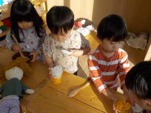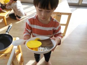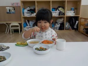 そら組では、うどん作り・クッキー作り・カレーライス作りと、様々な調理体験を行ってきました。食感・匂い・色等、見ただけでは気付かなかった発見がたくさんありました。実際に触れたり作ってみることで、食事中に「この野菜は何?」「何が入っているの?」と食材に興味を示したり、遊びの中でも、ケーキ・うどん・カレー等見立てて遊ぶ姿が多く見られています。今後も様々な調理体験や食育を通し、食への意欲や関心を深められるよう取り組んでいきます。