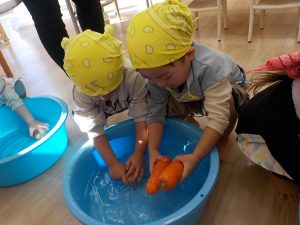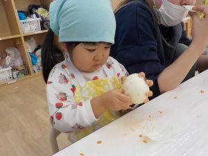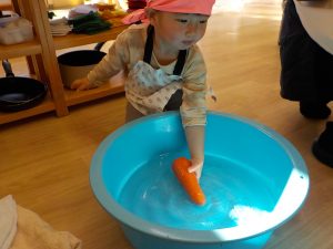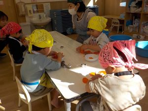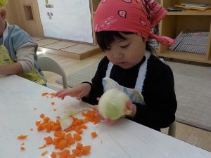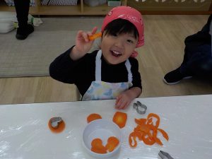 人参の型抜きでは、「見て!ウサギさんできたよ。」「鳥さんにしたの!」等、子どもたち同士でもやり取りをし、共有する姿がありました。子どもたちの“やりたい”という意欲に寄り添いながら見守り関わっていきました。