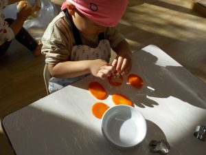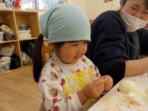 一通りのカレー作りの活動を終えた後も、食材に触れることを楽しむ子どもたち。型抜きに使った人参を指でちぎったり、押し潰したり、型抜きを包丁のように使いトントントンと細かく刻むことを楽しんでいました。玉ねぎは剥く、ちぎるを夢中になって行い、剥いているうちに目に染みて痛いという経験もしました。また、手に玉ねぎの匂いが付き、「玉ねぎの匂いする。」と手を洗っても匂いが消えないことにも気づき不思議に感じていました。