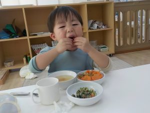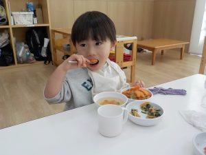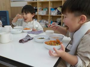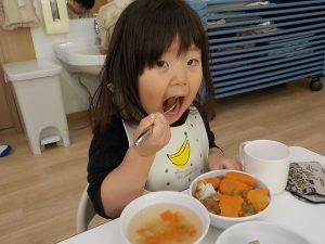 待ちに待った給食では、カレーライスが出てくると「○○ちゃんの!」「僕が作った人参あった!」「見て見て!ウサギさんいっぱい!」「美味しいね。」等、嬉しそうに食べる様子がありました。