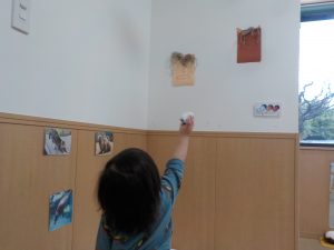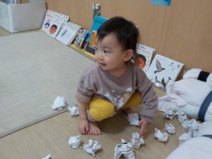節分関連の絵本を読み、鬼や豆まきに興味を持っています。豆まきを再現して楽しめるよう紙を丸めて豆に見立ててみると投げています。「鬼は外」と保育者が掛け声を言うと、「おにー」「そとー」と真似ています。画用紙と毛糸で作った鬼を壁に貼ると、鬼にめがけて投げる姿が見られていました。