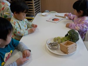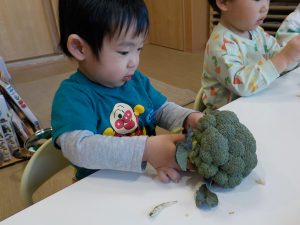 大豆やふきのとう、ブロッコリー等の感触や調理の仕方を伝えると、「固いね」「(鍋で)グツグツだね」と保育者の言葉を模倣しながら触れています。