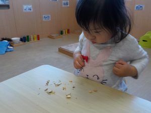 季節の図鑑を通して節分についてやりとりしながら、給食で恵方巻が出ることを伝えると興味を持つ姿があり、調理室へ見に行っています。「まきまきしてるね」「(具材は)にんじんときゅうり」「のりパラパラ」と保育者と共有しています。保育室へ戻ると新聞紙やフェルトで「まきまき」と再現しています。給食の時間には「みたね」と味わっていましたよ。