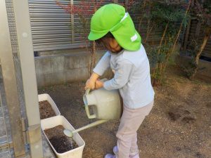 にじ組(3歳児クラス)ひかり組(4歳児クラス)では、お花のお世話をしています。