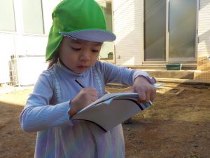 当番活動が終わるとクラスに戻り、「まだ芽が出てなかった」と花の状態を友だちや保育者に共有したり、生長の様子をオリジナル手帳に記入する姿も見られます。