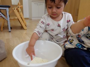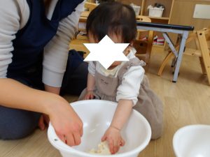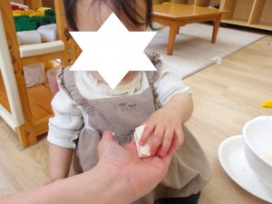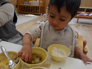 保育者が豆腐を持って来ると興味を示してすぐに近づく子もいれば