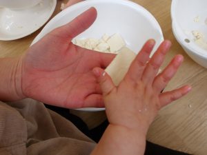 豆腐の感触を感じたり、形が変わったりするたびに、子ども達の表情が変わり、