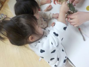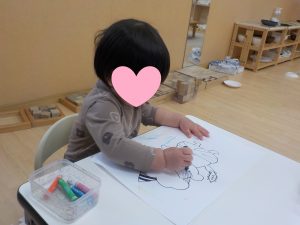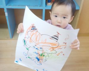 つき組では、鬼の絵が描いてある画用紙とクレヨンを用紙すると、「おに!」と興味を持ち、それぞれ好きな色で描き、思い思いの色が塗れると、満足そうに「できた!」と見せてくれましたよ